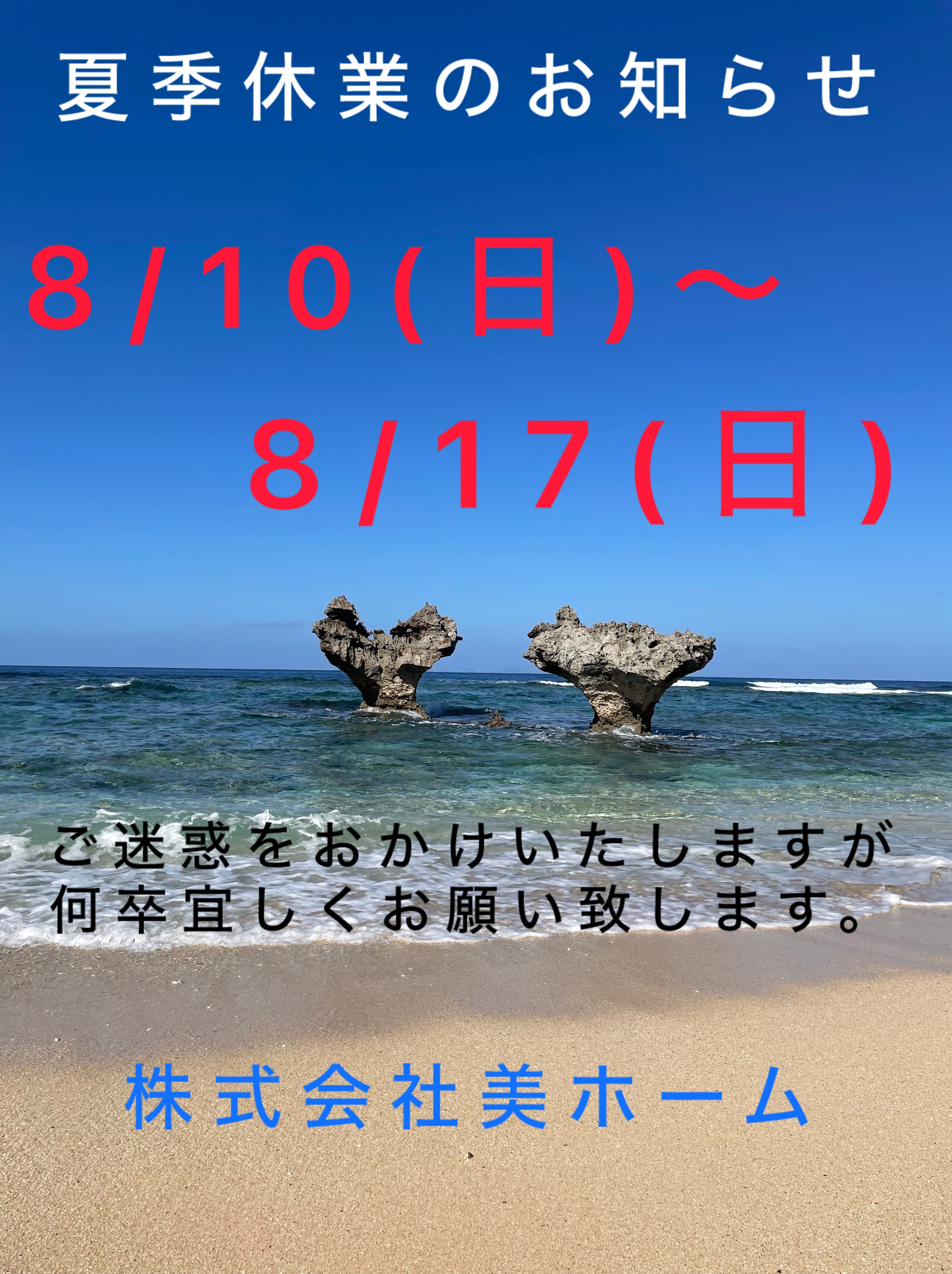 株式会社美ホームは下記の通り夏季休業とさせていただきます。